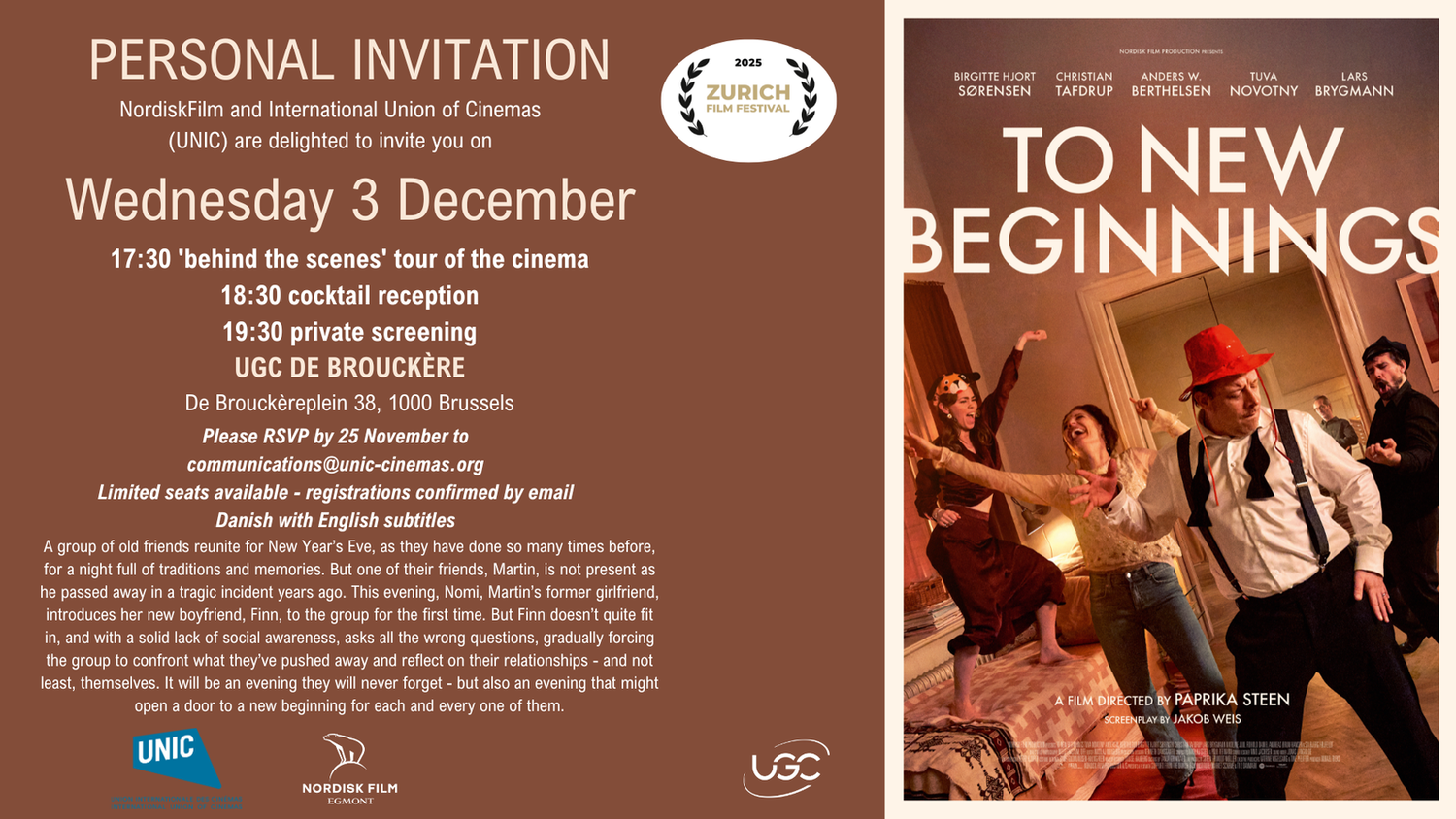 The best way to share our passion for the big screen is to let EU policy-makers experience cinema-going first hand, which is why UNIC - in collaboration with major European film companies and partners - has organised exclusive premieres of outstanding European films, coupled with policy debates and presentations by film industry professionals. UNIC is on the constant lookout for upcoming European cinema success stories to be showcased in the heart of Europe. Please find below a list of our previous screenings.
